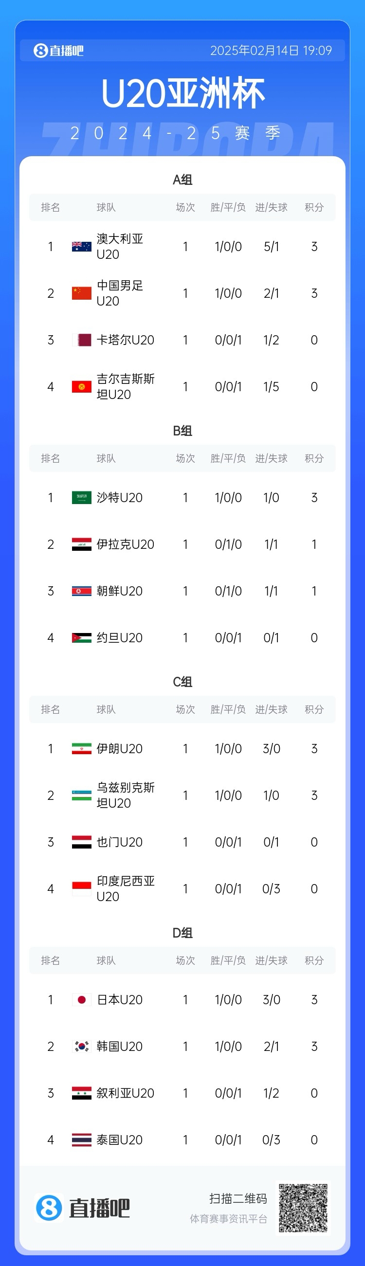 02月14日訊 U20亞洲杯D組首輪今日戰(zhàn)罷,賽后D組積分榜形勢(shì)如圖。日韓均獲開(kāi)門(mén)紅分列前兩名,泰國(guó)下輪若輸給韓國(guó)將提前出局。 本文標(biāo)簽: 足球 中超 中國(guó)足球 國(guó)家隊(duì)