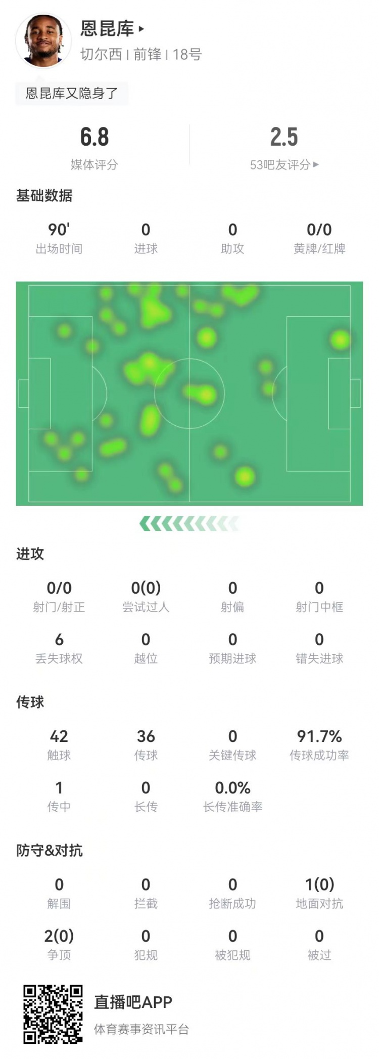 2月15日訊 切爾西在本輪英超0-3不敵布萊頓,恩昆庫(kù)本場(chǎng)客串中鋒數(shù)據(jù)如下:首發(fā)踢滿全場(chǎng)0射門0過人42觸球36傳球、33成功,成功率92%0關(guān)鍵傳球1傳中、0成功0長(zhǎng)傳3對(duì)抗、0成功6丟失球權(quán)獲評(píng)6.8分 本文標(biāo)簽: 足球 英超 切爾西 布萊頓