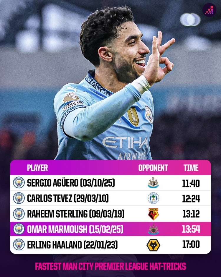 2月16日訊 曼城在本輪英超3-0領(lǐng)先紐卡,馬爾穆什上半場戴帽,數(shù)據(jù)統(tǒng)計顯示他3粒進球間隔僅13分54秒。