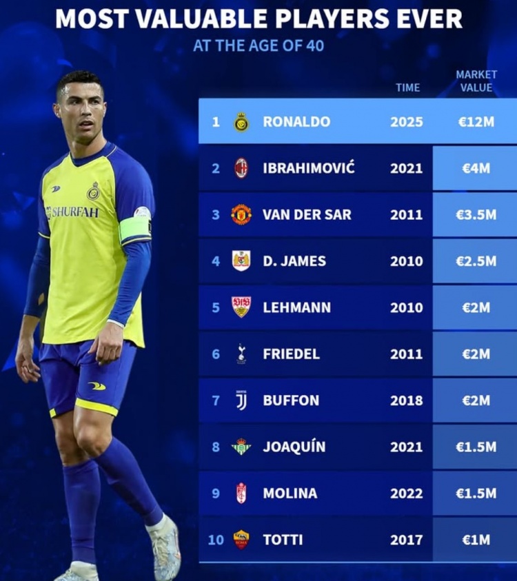 2月5日訊 C羅在今日迎來40歲生日,《轉(zhuǎn)會市場》也列出了40歲球員歷史身價最貴榜單,C羅無懸念居首。