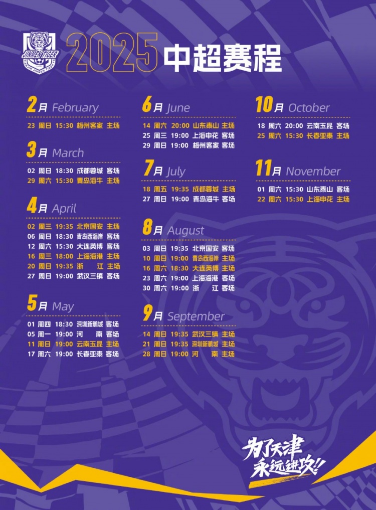 1.2025賽季中超聯(lián)賽天津津門虎隊(duì)全部主場賽事